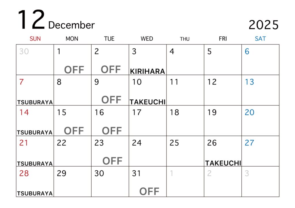 【2025年12月の定休日及び冬季休暇のお知らせ】