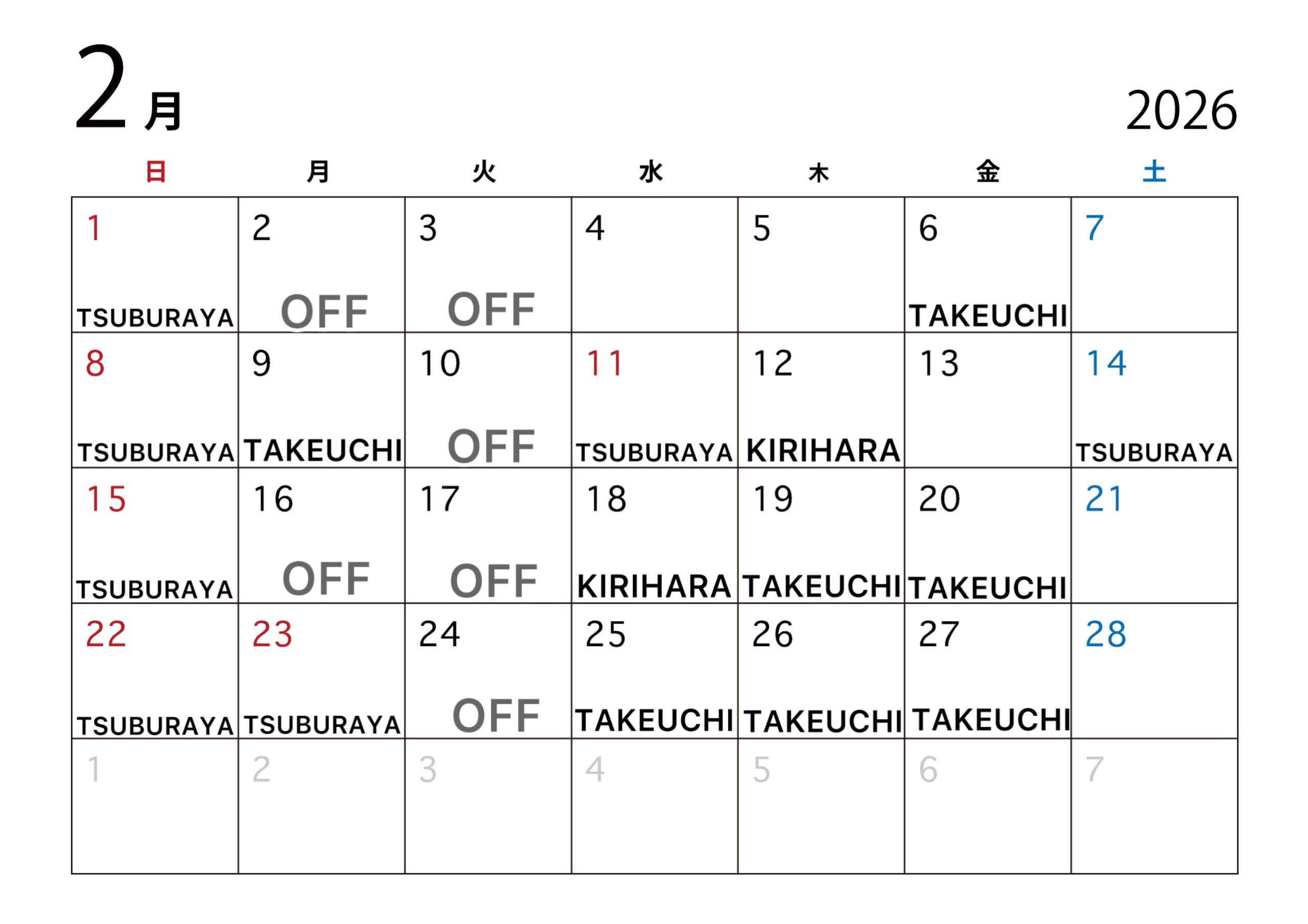 2月は毎週火曜日、第1、第3月曜日の、2日、16日が定休日となります。
